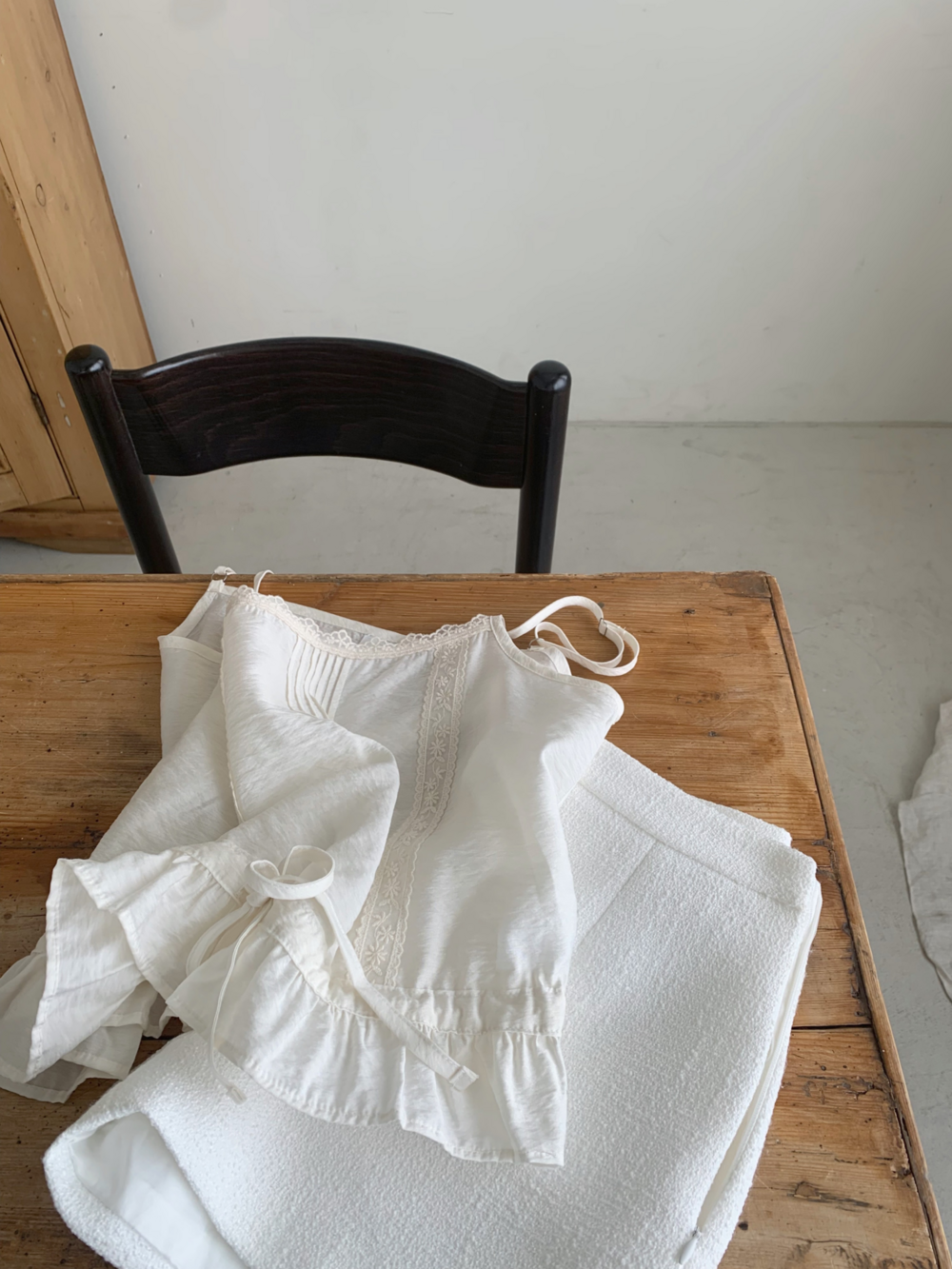 하늘하늘 가볍게 떨어지는 블라우스 소재에 레이스 트리밍과