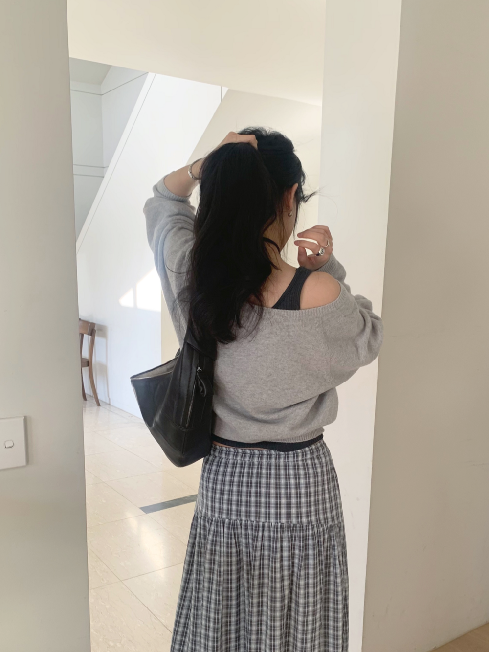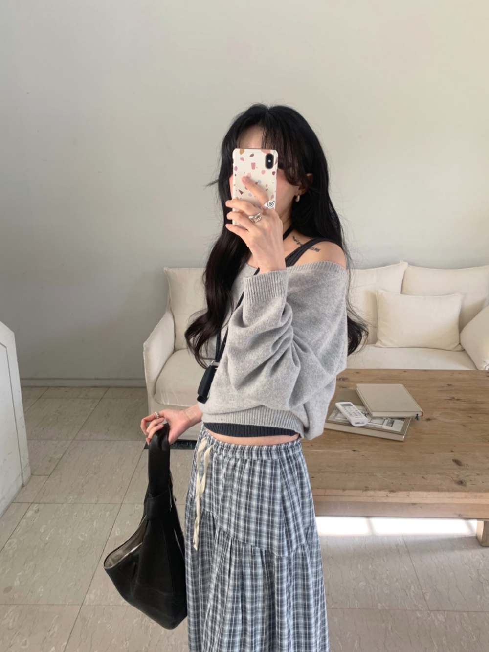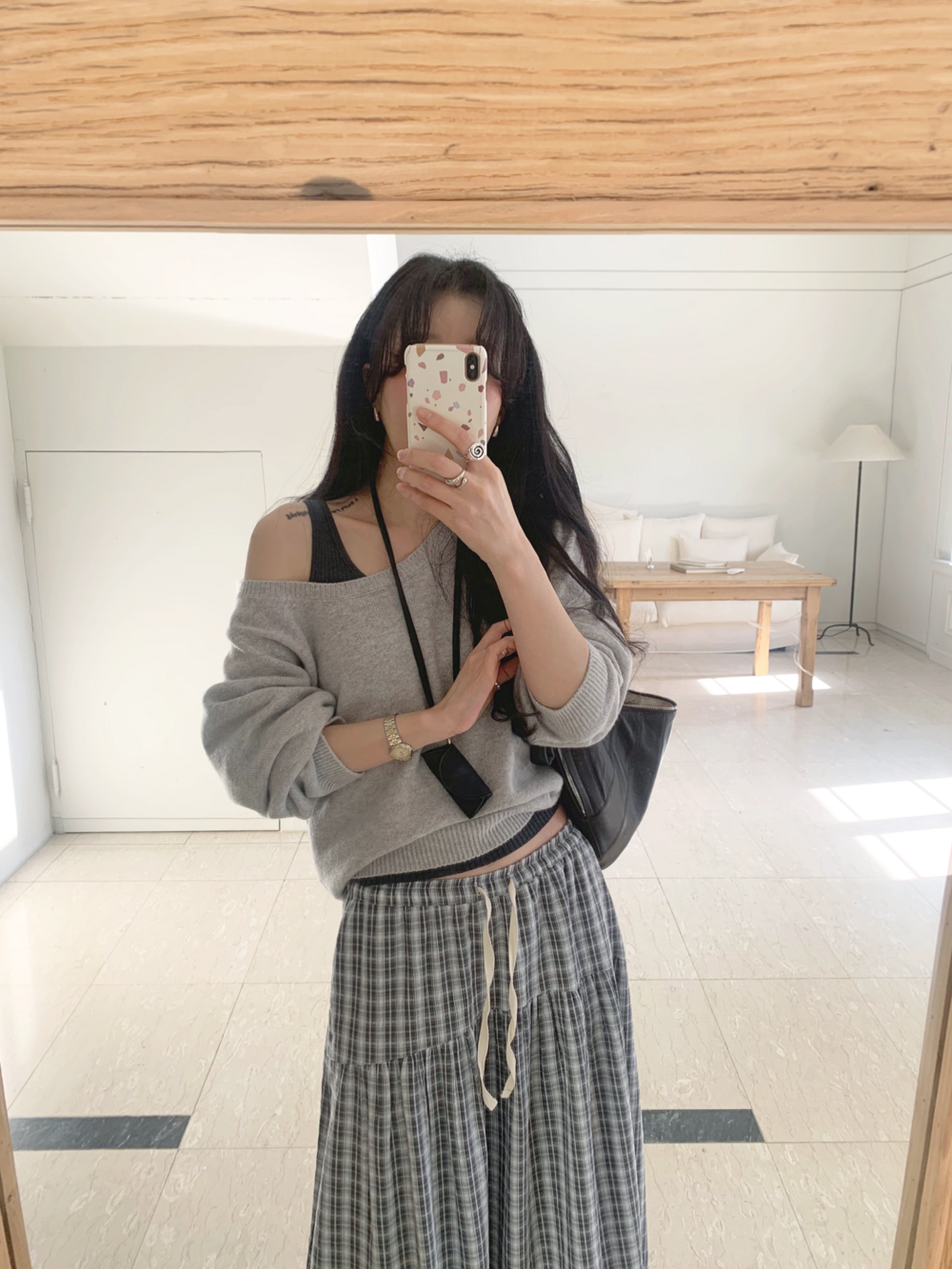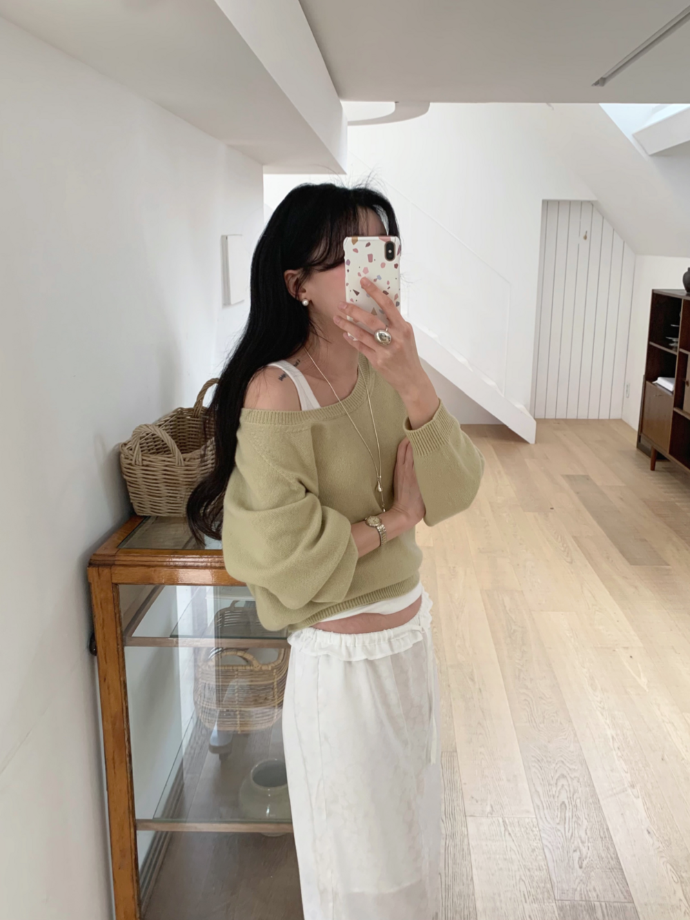 숄더라인이 돋보이는 니트탑 보여드려요.