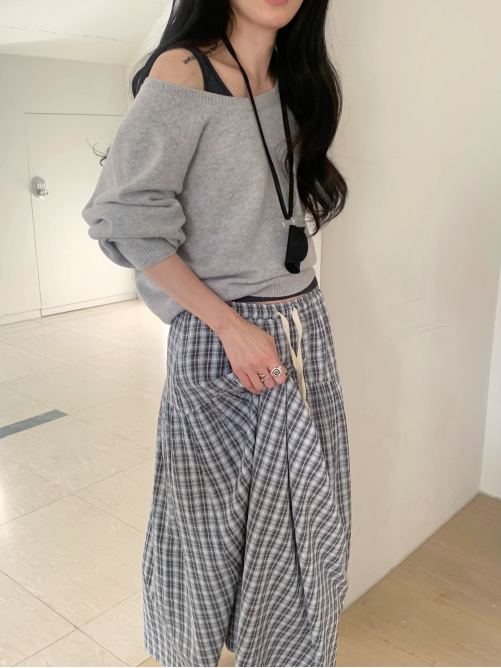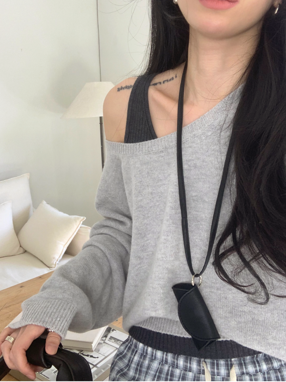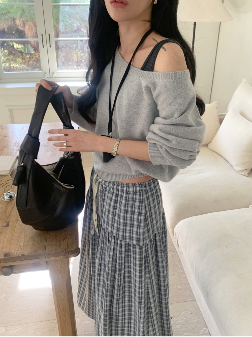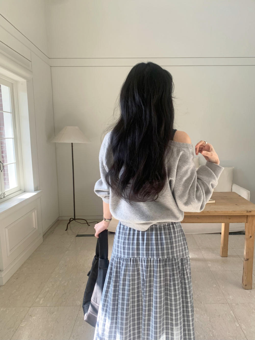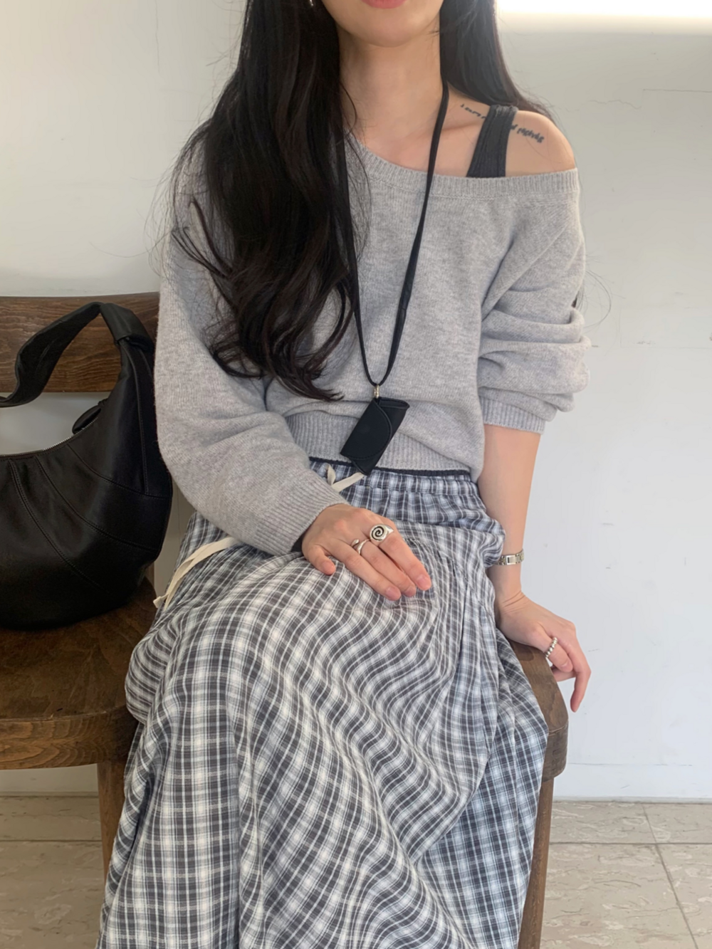 숄더라인이 돋보이는 니트탑 보여드려요.