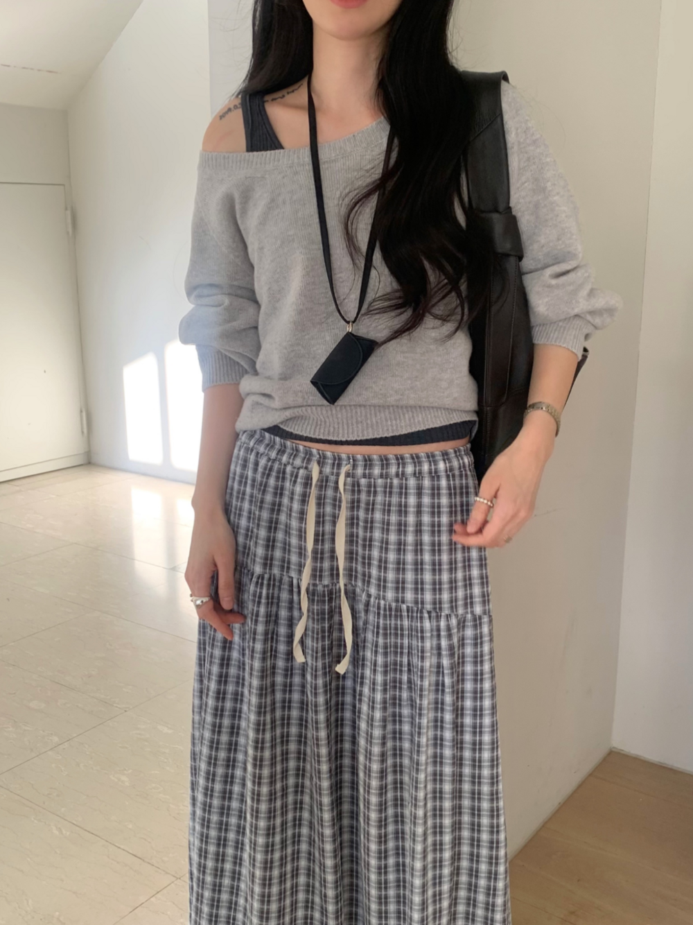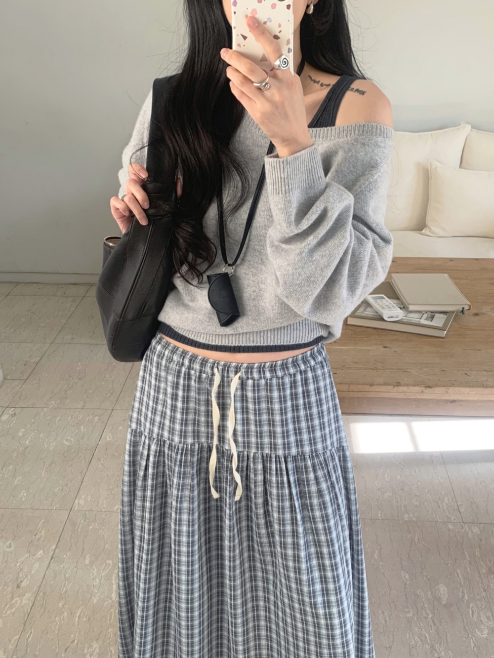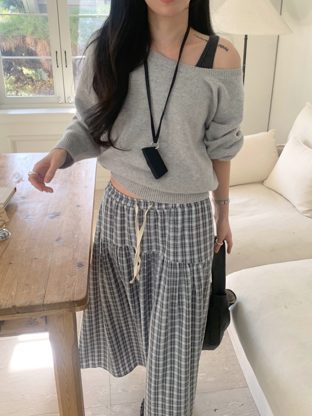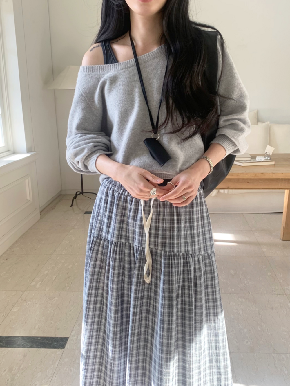 숄더라인이 돋보이는 니트탑 보여드려요.