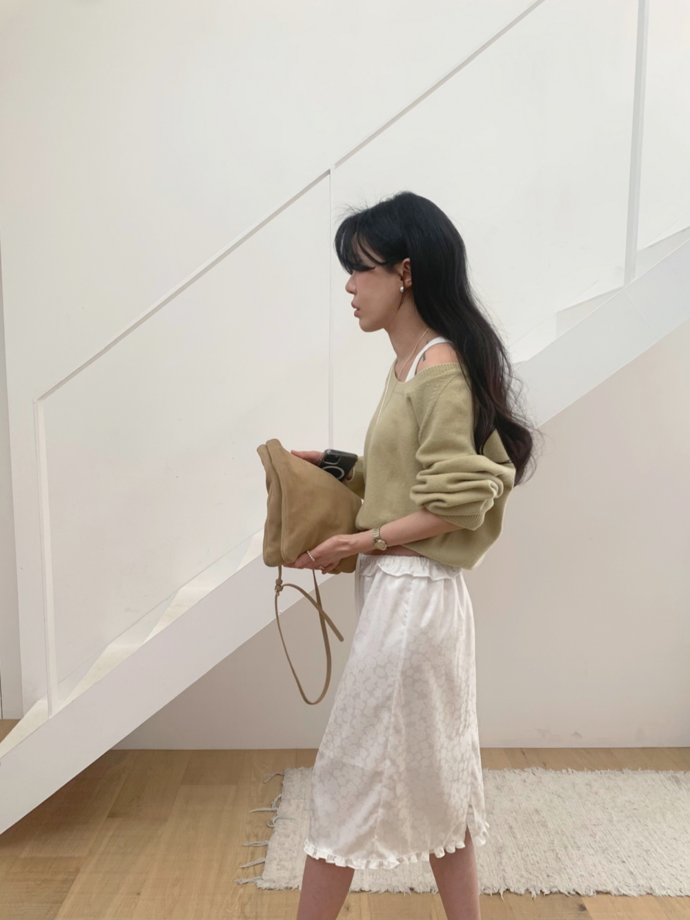 화사하면서 룩에 포인트가 되어주는 올리브 컬러 구성으로